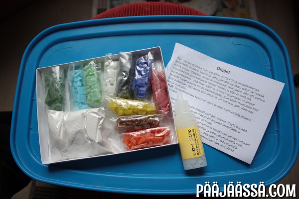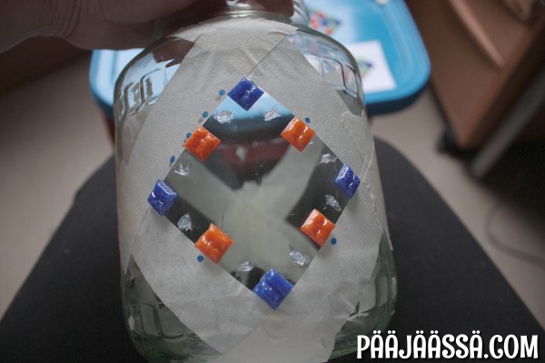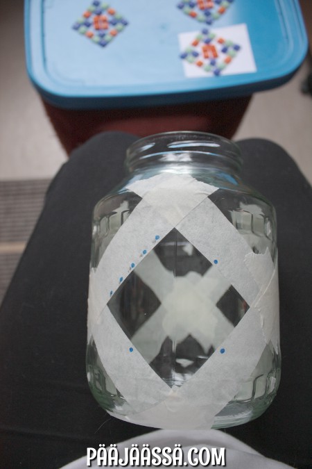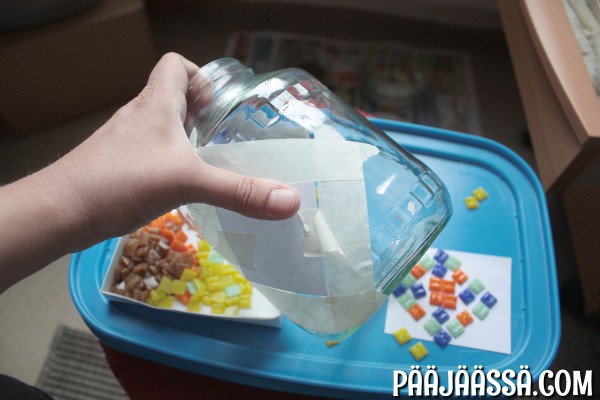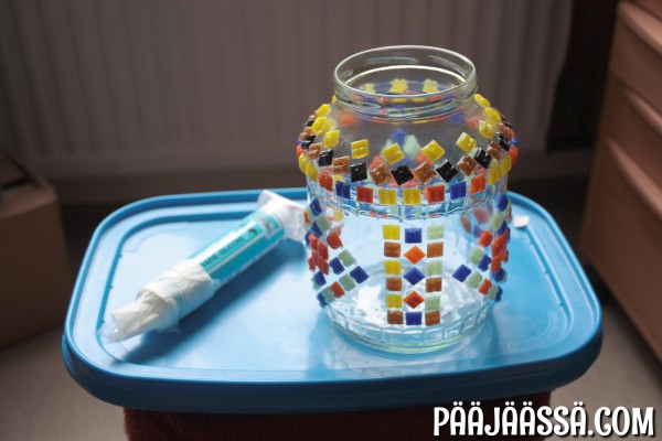Ostin tällaisen mosaiikkisetin Tiimarista ja lisäksi minulla oli puhdistettu lasipurkki, jossa on aikanaan ollut suolakurkkuja. Etiketit lähtevät lämpimällä saippuavedellä irti aika näpsäkästi.