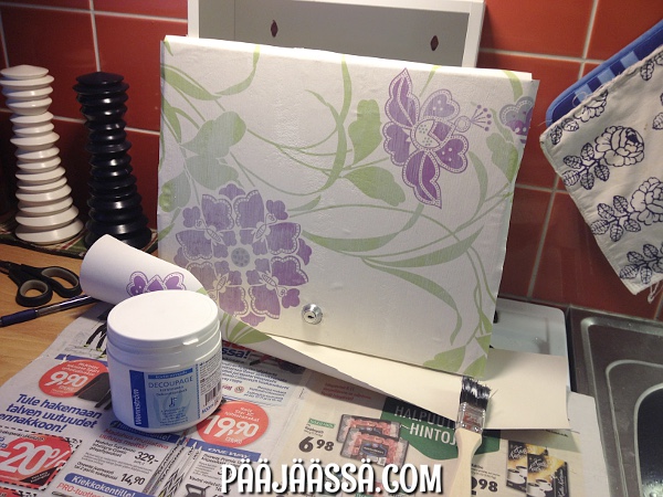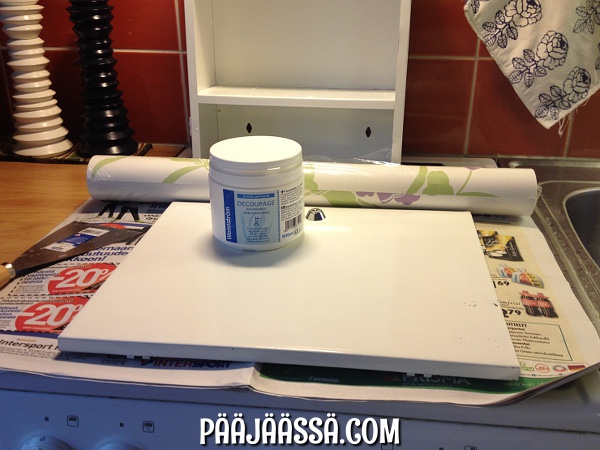 Ei muuta kuin virittelemään alustaa sanomalehdistä, jonka päällä on hyvä levittää Decoupagea kanteen. Lisäksi minulta löytyi avaamaton tapettirulla, jota aioin käyttää päällystämisessä. Samaa tapettia aion käyttää erääseen toiseenkin projektiin, mutta siitä sitten tuonnempana, kunhan olen projektin äärellä 😉