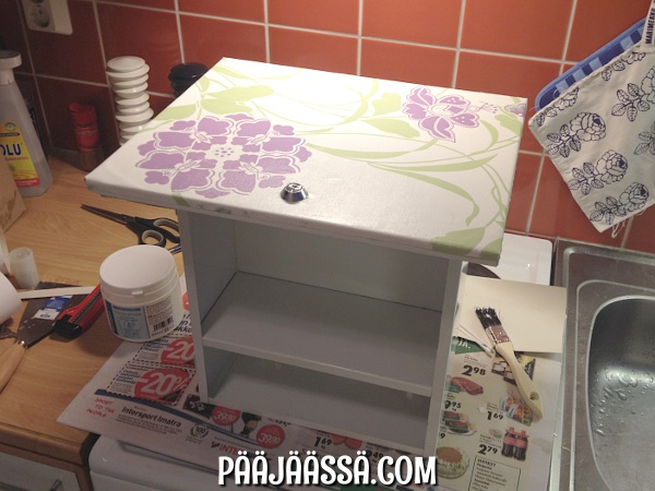 Levitin Decoupagea kanteen ja asettelin tapetin paikoilleen (huom avainreikä). Leikattuani ylimääräiset osat pois, levitin vielä Decoupagea tapetin päälle. Nostin kannen kuivumaan joksikin aikaa. Se kuivui yllättävän nopeasti, noin puolessa tunnissa. ”Pakkelissa” on hienoa se, että siitä tulee rätillä pyyhittävä pinta materiaaleille. Koska tämä kaappi oli menossa kylppäriin, halusin sen ns. roiskesuojatuksi. Decoupage tekee juuri tämän. Jos sitä ei laittaisi tapetin päälle, saattaisi jotkut roiskeet mennä tapetista läpi. Nyt ne voi vain pyyhkiä rätillä pois kannesta! Eli, pakkelia alle ja päälle.