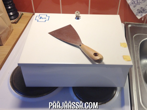 Olin aiemmin hankkinut seinään ripustettavia metallihäkkyröitä (-telineitä), jotka eivät mielestäni silmää hivelleet. Ne olivat siis väliaikaisratkaisu ja halusin niistä eroon. Sattumalta kummitätini oli aikanaan lahjoittanut minulle kierrätykseen menevän peltisen lääkekaapin, jota ei itse tarvinnut. Päätin siis tuunata sen ja tehdä siitä kylppäriin kaapin pikkutavaroille, ja poistaa metallihäkkyrät rumentamasta seinätilaa. Tässä siis DIY-vaiheet:
