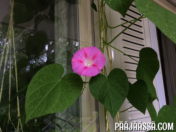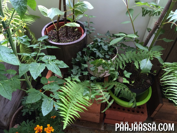 Tässä kohtaa parveketta, tässä näkymässä, oma silmäni lepää eniten! Juuri sitä puistomaista tunnelmaa, jota olen tähän hakenut.
