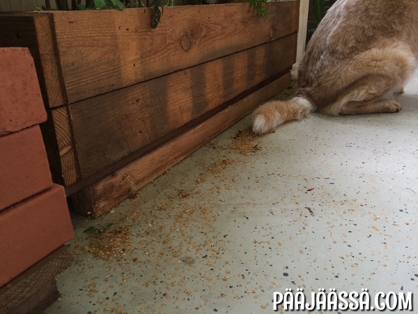 Harvemmin partsilla tarvitsee olla yksin… yleensä koko lemmikkirepertuaari on mukana! Foxi-koiraa kiinnostaa niin kovasti kissojen leikit ja niitä pitää seurata joka kerta kun mahdollista. Tässä Uuno temusi taka-alalla parvekepenkin kanssa 🙂