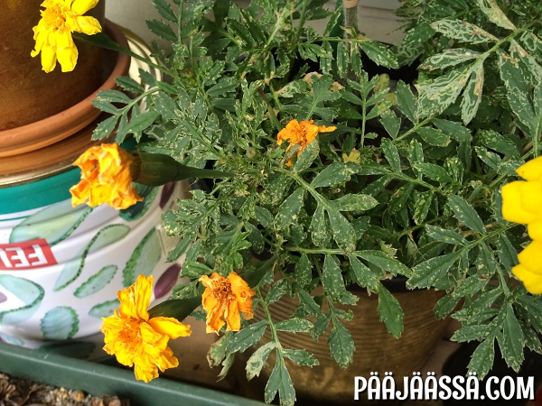 En tiedä mitä ihmettä tänä vuonna näissä kaikissa samettikukissa oikein on? Kaikkiin on tullut tuollaisia ”polkuja”. Varmaan joku toukka käynyt näitä popsimassa. Osa sammareista on jo menetetty ja ne ovat myös basilikan kimpussa :/