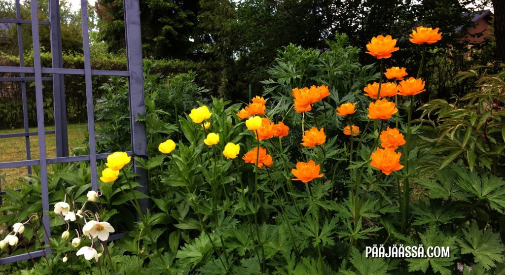 Kävin välillä tarkkailemassa äidin pihaa. Äidille istuttamani kullerot kukkivat ihan täysiään 11.6.2017. Tämän jälkeen satoi muutaman päivän vettä lähes yhtäjaksoisesti, ja suuurin osa kukinnoista tippui. Oranssi kullero tuossa perinteisen keltaisen seassa on jalokullero, jonka olen saanut tuttavaltani.