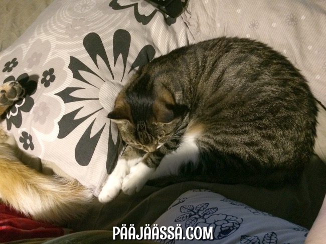 Uuno on ollut joka ilta käpertyneenä viereen kun olen läppärini ääressä tekemässä milloin mitäkin… niinkuin vaikka asentamassa ohjelmia ja päivityksiä. Kuvasta näkyy Foxyn häntäkin… kaikki vieressä välillä yhtäaikaa 🙂