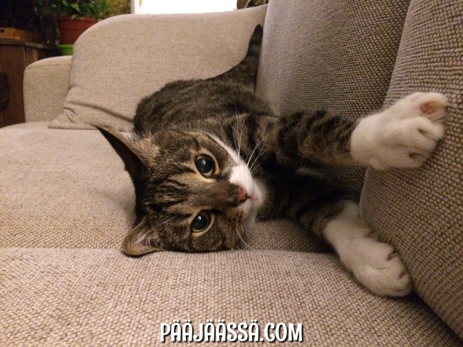 Uuno se on ottanut uuden sohvan hyvin vastaan… sitä pitkin on kiva vetää ihteään! Oli heti alkuunsa laitettava kissakuva 😀