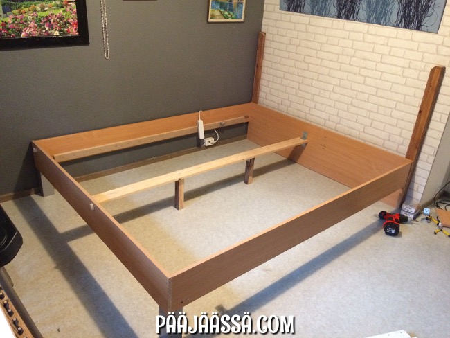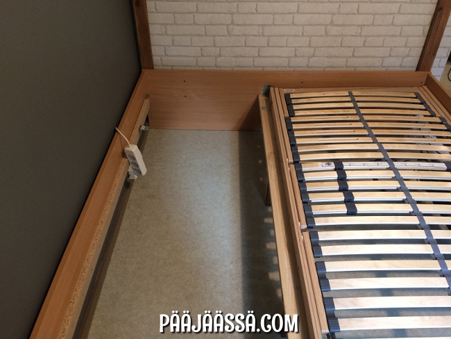 Sängyn laitaan jäi 70cm:n aukko, mihinkä pitäisi sitten hankkia säleikköpohja. Siinä on tällä hetkellä viritykset, joista en ottanut kuvia, enkä ala sänkyä nyt purkamaankaan sitä varten. Löysin sopivan säleikön Ikeasta (yllätys). Pitäisi vain tilata se.