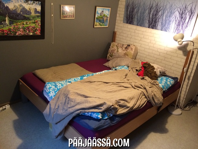 Olin pidemmän aikaa miettinyt, että sängylle pitäisi tehdä jotain. Se hädin tuskin mahtui makkariin. Pidän suuremman makkarin työkäytössä, ja tällä pienemmällä puolella on muutenkin mukavampi nukkua, kun aamuaurinko ei paista. Ikkuna on näet länteen päin. Massiivinen sänkyviritelmä on 185cm leveä. Siinä on moottorisänkypohjat, joita on kaksi kappaletta. En siis tee toisella yhtään mitään, niin se saa kyllä lähteä. (on myynnissä).