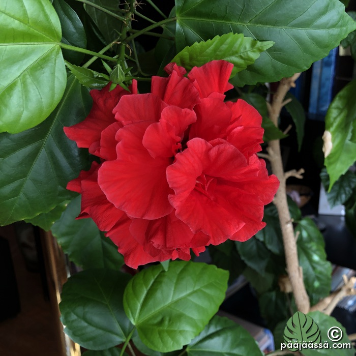 Ensinnäkin on pakko laittaa kuva isäni kiinanruususta, kun se kukkii. Isäni on taatusti aikoinaan vaikuttanut omaankin huonekasviharrastukseeni. En tiedä mitä ihmettä hän oikein tekee, koska hänen kiinanruusunsa kukkii joka vuosi ja omani ei. Toki asumme erilaisissa asunnoissa: isäni asuu omakotitalossa ja minä kerrostalossa. Huoneiston kosteudella on väliä. Siirsin myös oman kiinanruusuni eteläiselle ikkunalle, josko se vaikuttaisi asiaan. Nyt ne ovat molemmilla siis ”samalla puolella”. Minun kiinanruusuni on siis pistokas tästä isäni kiinanruususta.