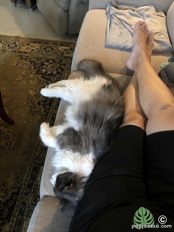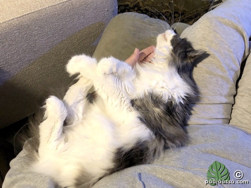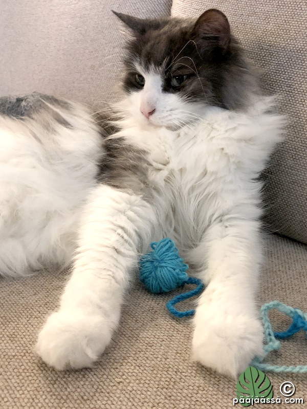 Pitkän turkin huolto on kyllä tuottanut hieman ongelmia. Siinä kohtaa Urho ei ihan vielä luota minuun. Olen saanut harjata selkäpuolelta ja rintakarvoja joka päivä, mutta vatsan puolelta ja kainaloista harjaamiseen kului noin viikko, kun sain niihin koskea. Perskarvoja ei saa harjata edelleenkään, eikä häntää. Luulen, että siellä on sellaisia takkuja joiden harjaus tekee kipeää. Siksipä teinkin sellaisen siirron, että soitin Urholle ajan trimmaukseen. Eli, nyt vaan vielä kuvia pitkäkarvaisesta kissasta kun sillä on pitkä karva! Trimmausaika on 31.8.2021 joten aikaa minulla vielä on ottaa joitain kuvia.