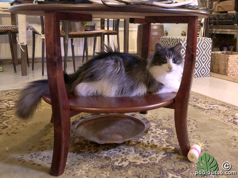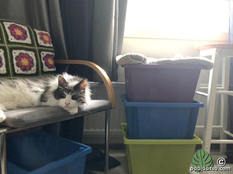 Olen laittanut hänelle useita paikkoja joissa voi nukkua. Katsellaan pitääkö hän niistä vai puranko ne vaan yksinkertaisesti pois. Esimerkiksi olen kasannut hänelle makuuhuoneen ikkunan alle pedin korkeammalle, josta hän pääsee myös ikkunalle tiirailemaan ulos. Ei ole nukkunut siinä nähdäkseni kertaakaan. En ole edes nähnyt että olisi kävellyt sen yli mennäkseen katselemaan ulos ikkunan viereen laitetulle jakkaralle. Sen sijaan sänkyni vieressä oleva tuoli on ahkerassa käytössä.