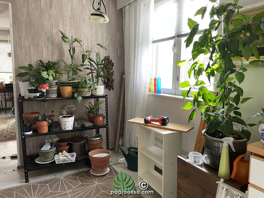 Tarkoituksenani on lajitella nuo saviset terracotta-ruukut ja pinota ne vähän kauniimmin. Niin, siis niistä on tulossa olohuoneen puolelle visuaaliseksi tarkoitettu lajitelma kukkahyllyyn. Tuossa edellisessä kuvassa kaikki on vaan heitetty tuohon ”jaloista pois”. Ne pitäisi myös jotenkin saada puhdistettua mullasta. En oikein tiedä missä tämän tekisin kun ei sitä kehtaa kylpyhuoneessakaan tehdä. Pitää kait mennä pesutuvalle. Siinä taas yksi iso projekti, kun raahaa ne ruukut sinne alakertaan.