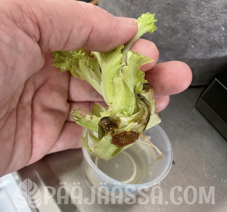 Kokeilin huvikseni mitä tapahtuu, kun laittaa kaupasta ostetun salaattikerän kannan veteen. Siihenhän kasvoi pari juurta! En kuitenkaan laittanut kantaa multaan, mutta voishan sitäkin kokeilla jossain vaiheessa, josko siitä kasvaisi uusi salaatti. Mielestäni tuohonkin ilmestyi pari pientä lehteä. Heitin kokeilun kuitenkin pois, kun minulla ei tosiaan ollut sille mitään ihmeellisempää suunnitelmaa.