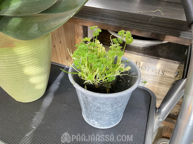 Tyrkkäsin myös persilijan vesilasiin jos se kasvaisi vähän siinä sitten… saattaa kyllä olla, että vesilasissa sen juuristo mädäntyy. Katsellaan. Käyn napsimassa sitä silloin tällöin suuhuni ja onhan siinä nyt ihan kunnon valokin yläpuolella, mikä saattaisi auttaa kasvamisessa myös.