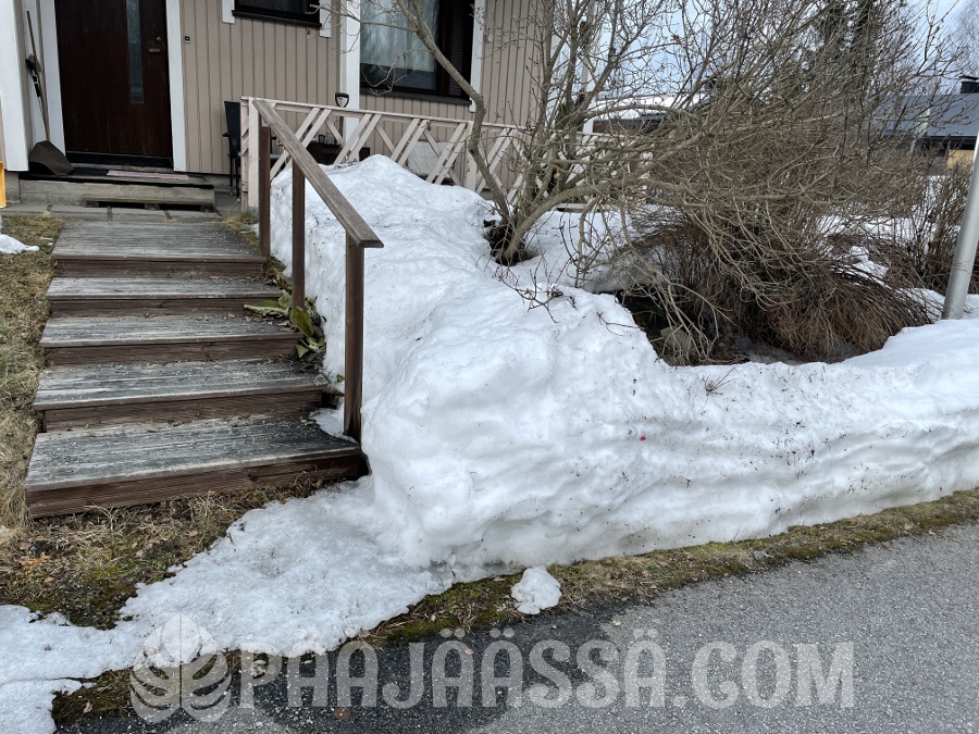Aika hyvin sitä lunta on kuitenkin sulanut, vaikka alkuunsa vähän ”pelottikin” mitenkä asian laita mahtaa olla kun kevät etenee. Nappasin kuvan vanhempieni pihalta eilen. Portaiden vieressä oli viikko sitten vielä korkeat kinokset. Tämä on tosin etelän puolella, mutta kuitenkin. Ja nyt sataa vettä. Voi olla että lumipeite saa kyytiä tänään oikein kunnolla.