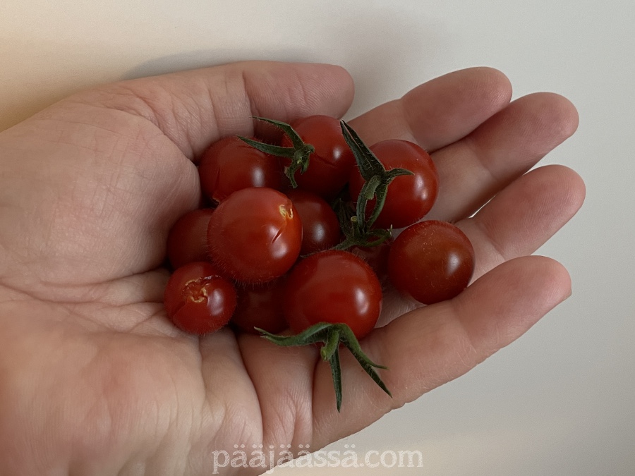 Saan miltei joka viikko tällaisen pienen kourallisen tomaatteja. Eihän tämä nyt mikään älytön sato ole, mutta kuitenkin tuli todettua, että homma voi jollain tasolla jopa käytännössäkin toimia. Eli uusia juttuja kokeilemaan tänäkin vuonna. Pitää vaan laittaa kasvamaan vähän suurempikokoista tomaattia, että niissä olisi jotain syötävääkin…