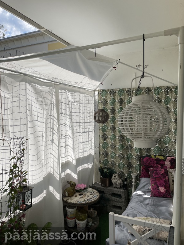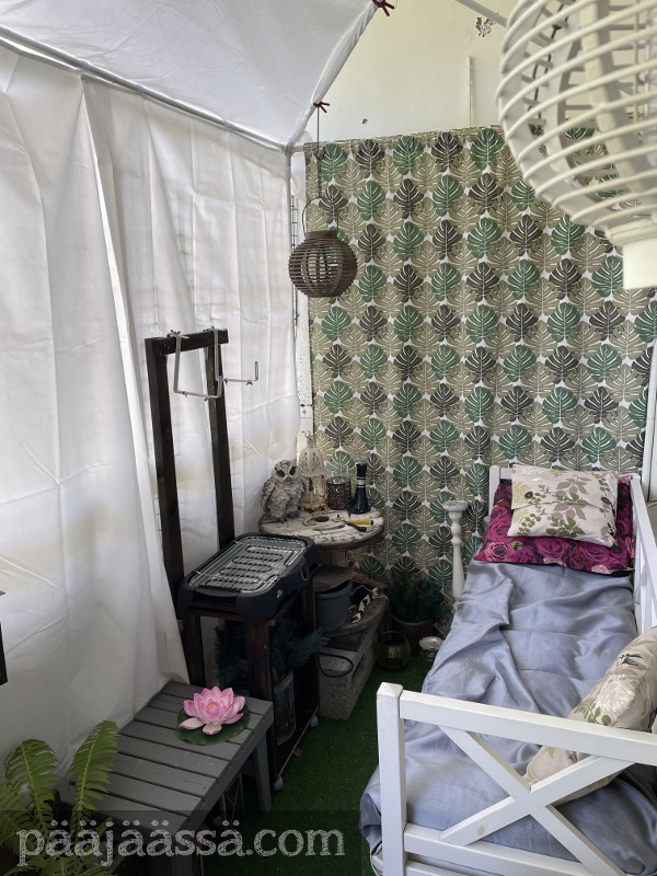 Mainitsin parvekeasiasta edellisessä artikkelissa, ja että siellä on mahdollisesti jotain uutta. Järjestelin muutamat tavarat siellä uudelleen, ja nyt se on mielestäni juuri sitä mitä pitääkin. Kuvassa näkyy hyvin pavilijongin runko, minkä sinne taiteilin eräs päivä. Sain aikaiseksi viritellä lisäksi siihen vielä katon etuosaan pienen suojakankaan, ettei tuosta kohdasta paista suoraan aurinko päähän, kun istuu sohvalla. Tältä se näytti alkujaan kun tavarat eivät vielä olleet ihan vielä paikoillaan:
