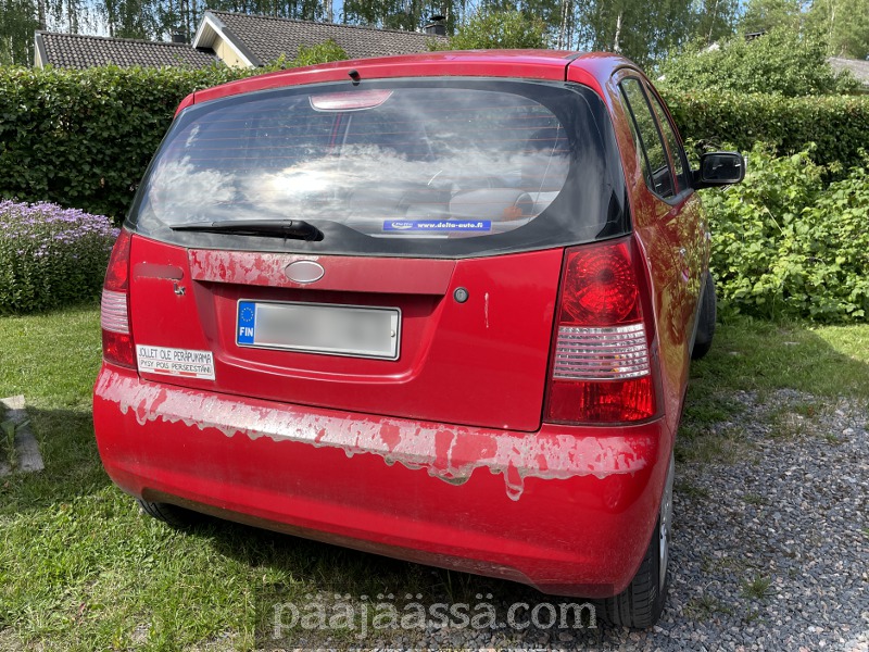 Sain joskus viisaammilta ohjeen hioa tuon kupruilevan lakkaosan pois. Olin käynyt ostamassa Puuilosta valmiiksi hiomahuovan (Hiomahuopa-arkit 150x230mm Ultrafine) ja akryylilakkaa, jolla nuo alueet voisi käsitellä. Huopa oli koko ajan autossa mukana odottelemassa, milloin se pääsisi käyttöön. Nyt hioin auton takaosan pikaisesti, koska pian olisi ukkonen päällä. Sain hiottua pahimmat lämpäreet pois. Kyllä on ihan erinäkönen auto mitä oli ennen pesua. Yksi huoli taas listalta pois.