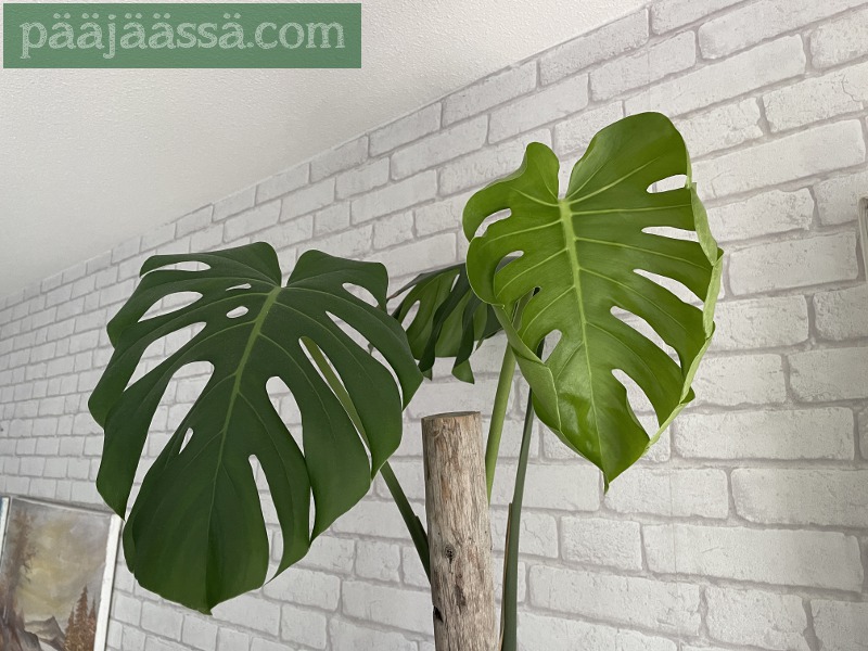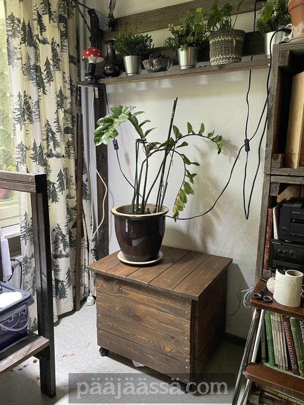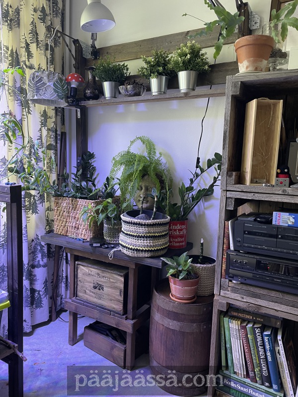 Siirsin nurkkaukseen väliaikaisesti yhden puupömpelin huonekasveja varten. Niitä on odottelemassa keittiössä vielä jokunen määrä. Osa pitäisi ruukuttaa kun on pistokkaina juurtumassa. Kuten huomata saattaa, tämäkin on itse rakennettu. Hupsista, ikkunan edessä näyttääkin vielä roikkuvan talviverho. Se on pitänyt myös vaihtaa ajat sitten, mutta vaan jäänyt. Jospa se sitten seuraavaksi.