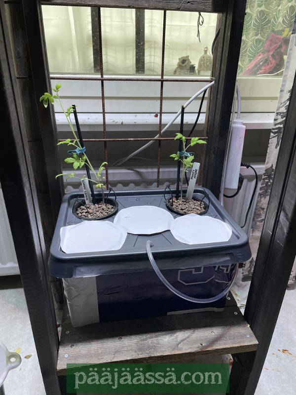 Sen verran homma jäi vielä kesken, että teen astialle jossain vaiheessa jostain koristeellisestä kankaasta jonkin hupun. Vesiastia on teipattu nyt ikkunateipillä, ettei siitä pääse auringonvalo läpi. Ei kaunis, mutta toimii. Hifistelen sitä sitten myöhemmin lisää. Suojasin ruukut, jotka eivät ole vielä käytössä itsetekemilläni ”lätkillä”, ettei niistä pääse valoa veteen. Hydrojutuista sitten lisää tulevaisuudessa, jos tämä viritelmä nyt onnistuu tällä kertaa.