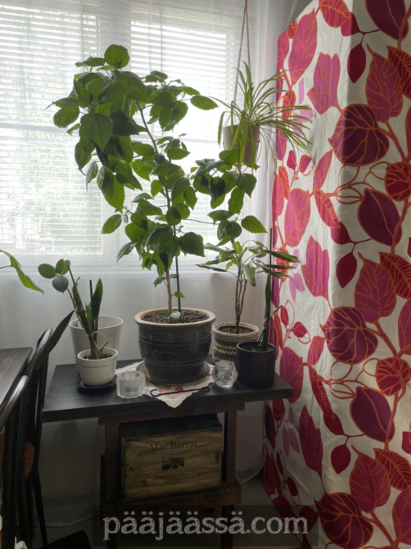 Olen miettinyt olohuoneen nurkkausta jo tovin, kun se ei oikein ollut käytännöllinen. Sitä paitsi, keittiön ikkunan äärelle piti saada kiinanruusulle jokin oma pöytä tai taso, missä se voi sitten olla kaikessa rauhassa läpi vuoden. Nyt se on ollut ruokapöydällä viemässä tilaa. Ja ei kun siirtelemään tavaroita taas vaihteeksi!