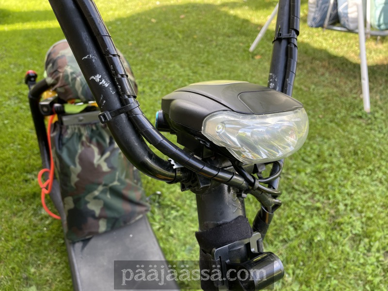 Olin epätoivoa täynnä, kun sähkökruiserin virtakopasta irtosi tekemäni viritelmä, eikä sitä saanut enää samalla tavalla kiinnitettyä ohjaushaarukkaan. Koppa piti purkaa. Huomasin myös, että siitä oli jäänyt matkan varrelle joitain ruuveja, jotka nyt sitten korvasin uudemmilla. Tästä oli katkennut alunperin sellainen liukukiinnike, mitä on vaikkapa joissain pyörävaloissa. Osa oli poikki ja piti keksiä jotain muuta tilalle.
