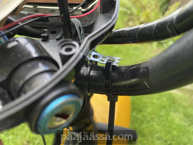 Otin aikaisemmin kiinni olleen reikävanteen ja pujotin sen kopan sisäpuolelta läpi, jotta sen voi kiinnittää toisella reikävanteen palalla haarukkaan. No sehän kävikin paremmin kuin hyvin, ja lopputuloksestakin tuli ihan siisti. Reikävannetta tarvitaan pieni pala vielä lisää, että saan kopan kiinnitettyä vielä toiseltakin puolelta. Se nyt kestäisi kuitenkin kyydissä sen verran kun ajelen vekottimella kotiin. Laitoin kiinnikkeeksi nippusiteen kunnes saan viriteltyä reikävanteen paikoilleen.