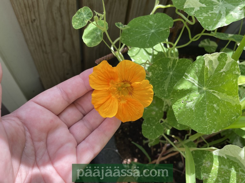 Parvekkeella myös kukkii istuttamani kanarianköynnöskrassi. Se on kyllä hyvin ”ujo” vielä, eikä ole sen ihmeemmin kasvanut. Pitää lannoitaa ilmeisesti jokaisella kastelukerralla. Se on samassa ruukussa maissin kanssa. Joku syö näitä rehuja tuolla… en yhden pienen toukan viskasin pois, mutta syöpöttely jatkuu vaan!