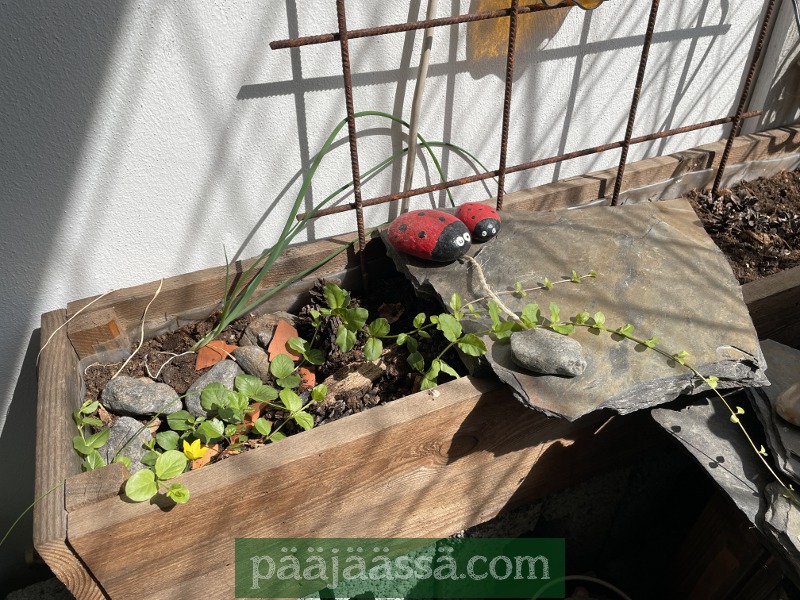 Siirsin kelapöydän nurkkaukseen harkkojen päälle, niin sai senkin puoleen vähän lisää tilaa. Kulmaukseen on vielä tarkoitus laittaa yksi kesäkukka, kunhan saan aikaiseksi. Multahommat ovat suht kivuliaita käsien kannalta, ja pyrin välttämään niitä viimeiseen asti. Pakko tässä on kuitenkin pikkuhiljaa alkaa laittelemaan, muun muassa, huonekasvien pistokkaita multiin. Mutta nyt alkaa kukkapöydätkin olla paikoillaan.