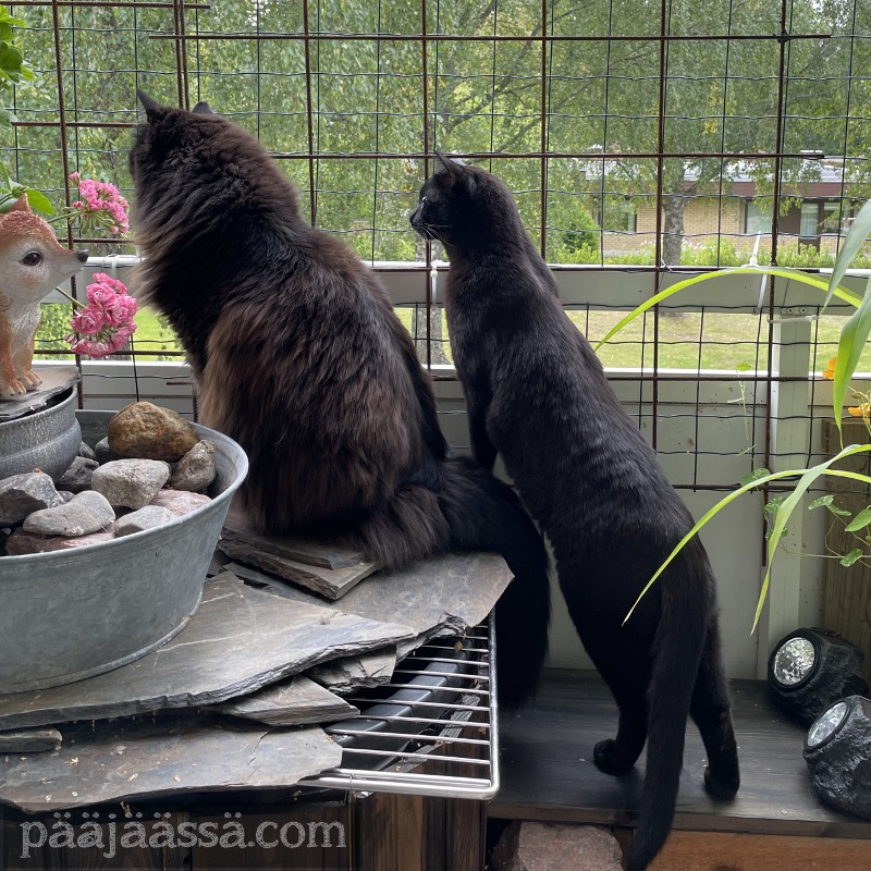 Minulla oli taas hoidossa pari kissaa, jotka ovat olleet hoidossa aikaisemminkin. Kisut ovat ilmeisesti tottuneet jo kämppääni, kun ne olivat heti todella rentoja. Virittelin niille partsille partiointipaikan vesiaiheen päälle, josta he pystyivät bongailemaan muun muassa lintuja.