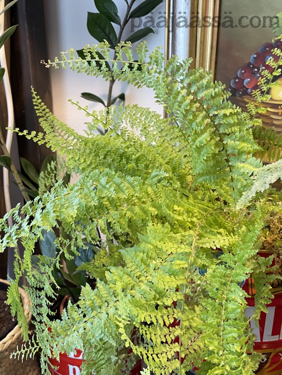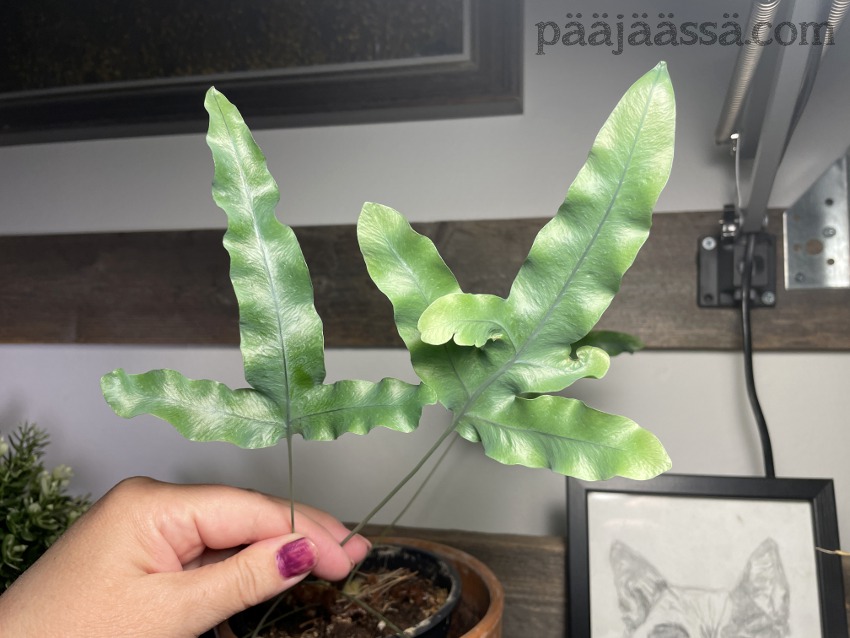 Vastoin kaikkia odotuksiani ja mielikuviani, olen ihmeissäni saniaisten viihtymisestä kämpässäni. Olen aina ollut siinä uskossa, että niitä täytyy sumutella ja viritellä kaiken maailman kostuttimia. Olen ollut väärässä! Tälläkin hetkellä ilmankosteus asunnossani on 20%, joka ei nyt ihan älyttömästi ole. Sen huomaa nenässä, kun sieraimet ovat ihan kuivat jatkuvasti. Myös pölyä on ilmassa kun on kuivaa.