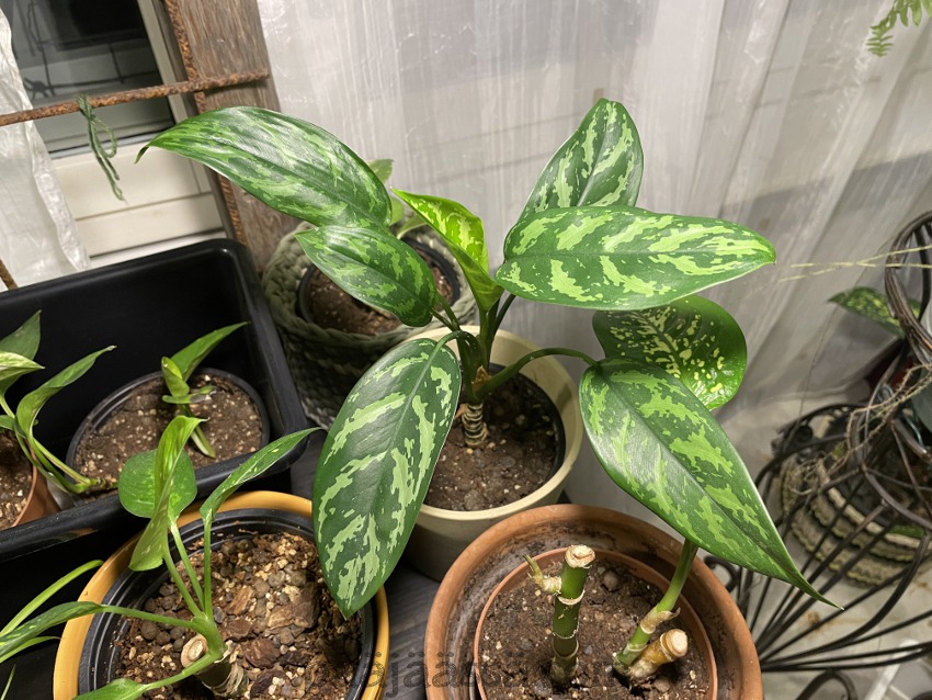 Muita talven huonekasvi selviytyjiä ovat kiinaruusu ja laikkuvehka. Olin istuttanut laikkuvehkan myös kookosperliittiseokseen, ja se ei meinannut selvitä talvesta sitten mitenkään. Lisäksi olin unohtanut laittaa ottamani kirjovehkan pistokaat multiin, mutta nekin näyttävät tällä hetkellä elonmerkkejä. Osa pistokkaista tosin mätäni ja heitin ne pois. En ole kaikkia pistokkaita kuvannut, mutta teen sen joku muu kaunis päivä. Nyt siihen uppoaisi ihan liikaa aikaa.
