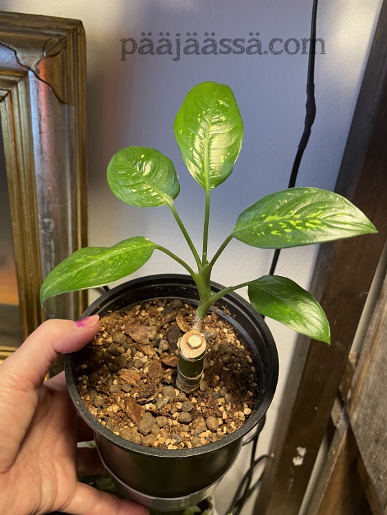 - Uusin muulinkorva ruukkuun. Kasvi on istutettu umpinaiseen ruukkuun ja se pitää siirtää reiälliseen muoviruukkuun. Tällä asialla on kiire. Lisäksi se tarvitsee kiipeilytuen.