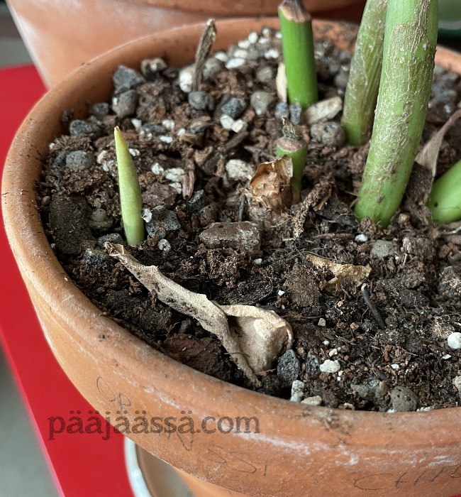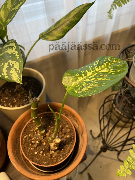 Jos jostain voi olla erittäin iloinen, niin siitä olen, kun miltei kaikki joulun tienoilla istuttamani huonekasvien pistokkaat ovat alkaneet tehdä uutta kasvua. Pelkäsin niin kovasti, että ihana malakanlaikkuvehkani heittää henkensä. Sain kun sainkin sen elpymään, ja tämä oli varmasti sen ansiota, kun istutin sen uudelleen kukkamultaan. Olin tehnyt jonkinlaisen ”kokeen” istuttaa kaikki rehut kookoskuituun. Se ei ollut hyvä idea lainkaan. Nyt kaikki huonekasvit on istutettava takaisin kukkamultaan. Otin tosin multaseokseen ruukuista kookoskuidunkin mukaan. Katsotaan mitä käy. Pitää seurata tilannetta.