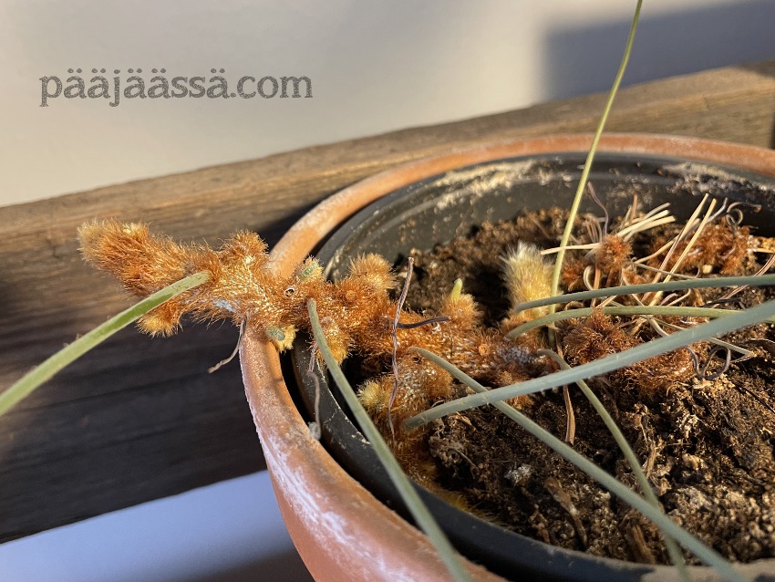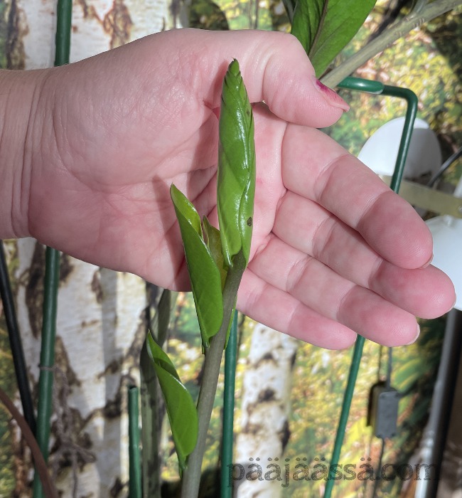 Jotkut asiat vaan karkaavat hieman lapasista, ja minullakin meni palmuvehkojen hankinta aikoinaan hieman överiksi. Ihmeen kaupalla nekään eivät ole kuolleet, vaikkakin niistä on kuollut todella paljon lehtivarsia tämän talven aikana. En tiedä missä vika, mutta siirsin kolmesta ruukusta juurakot uusiin ruukkuihin. Juurakot eivät nimittäin olleet mädäntyneet tai muutakaan, vaan ihan ok kunnossa. Huomasinkin, että yhdestä ruukusta alkoikin jo pilkottaa uuden lehtivarren alku. Myös vanhempi palmuvehka (kuvassa kämmentä vasten) on aloittanut uusien lehtivarsien noston.