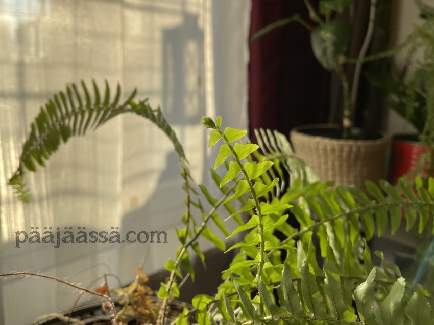 Keskittyminen herpaantuu nykyään todella helposti, ja kävinkin tässä välissä ennen seuraavien kasvien kuvia tutkimassa, mikä tuo Litukasta hankittu ihmesaniainen oikein on. Yllätyin! Se on Boston saniainen, Nephrolepis exaltata cv.