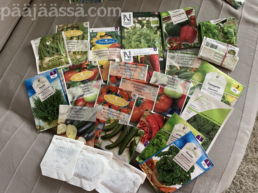Sain vihdoinkin aikaiseksi laittaa hyötykasvien siemeniä itämään. Projekti on ollut työn alla ties kuinka kauan jo, ja varmasti osa siemenistä tuli laitettua potteihin liian myöhään. Muun muassa paprikat olisi pitänyt laittaa itämään jo parisen kuukautta sitten. Katsellaan mitä niistä sitten oikein tulee. Ainakin siemenvarastosta löytyi vaikka sun mitä.
