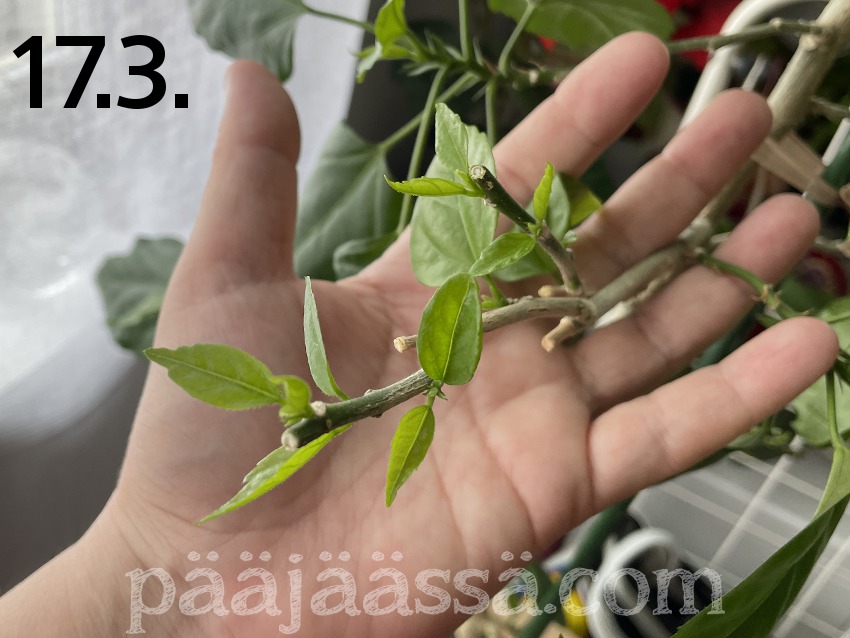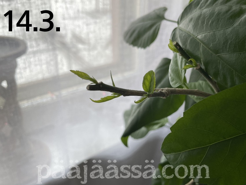 Kiinaruusu on alkanut tehdä uutta kasvustoa leikkaamisen jälkeen. Niinhän se aina tekee, vaikka sitä luulisi, että se kärsii siitä leikkaamisesta hirvittävästi. Jo muutamassa päivässä lehdet ovat suurentuneet.