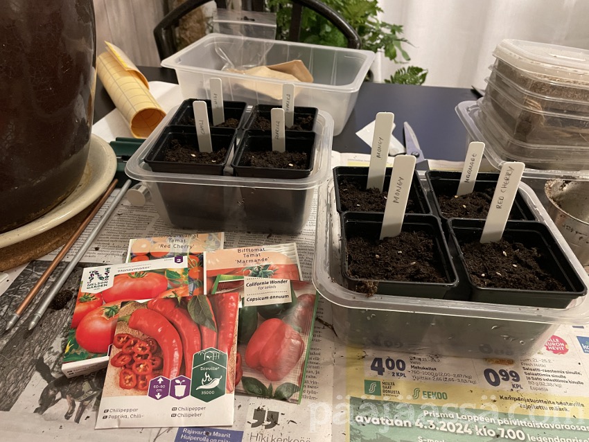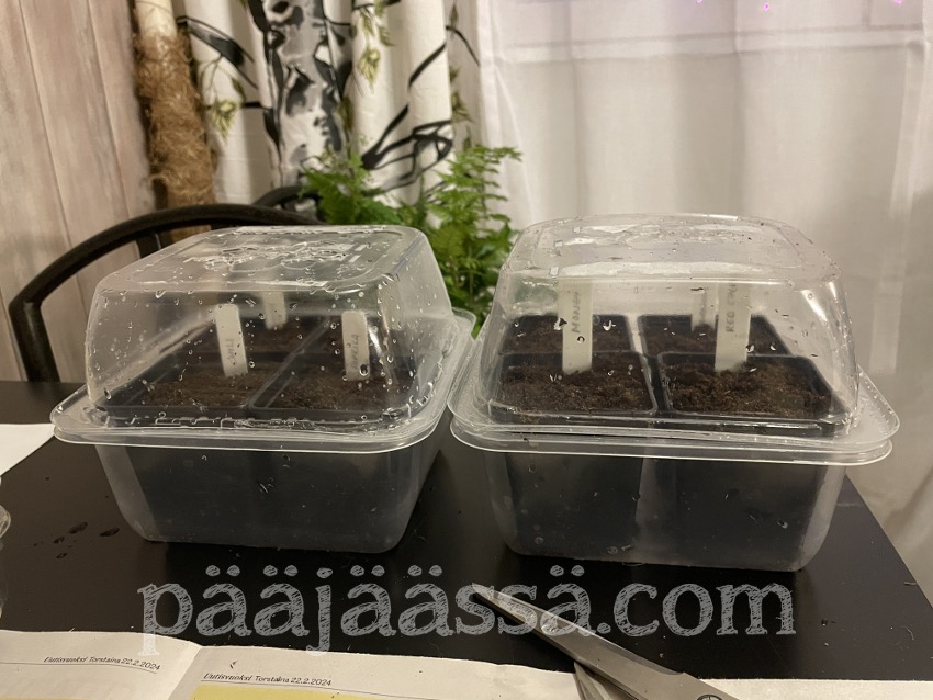 laitoin hyvin maltillisesti siemeniä itämään tällä kertaa. Toki kaikkea ei vielä kannata edes laittaa mutta tässä nyt jotakin. Toisessa rasiassa on paprikat ja chilit, toisessa tomaatit.