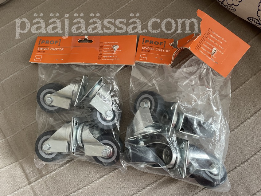 Olen pikkuhiljaa ostellut renkaita kalusteiden alle, että saan siirreltyä niitä helpommin. Yksin tällainenkin on todella hankalaa ja työlästä. Ihan joka paikkaan en niitä aio tunkea, mutta ainakin nyt muutaman hyllykön alle pitää laittaa. Oli paljon helpompaa siirtää kaksi päällekkäin olevaa hyllykköä olohuoneesta makuuhuoneeseen kun alla oli pyörät.