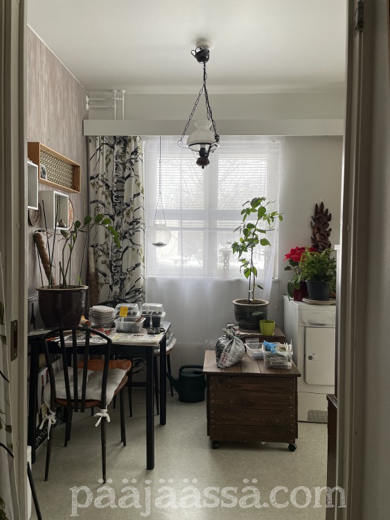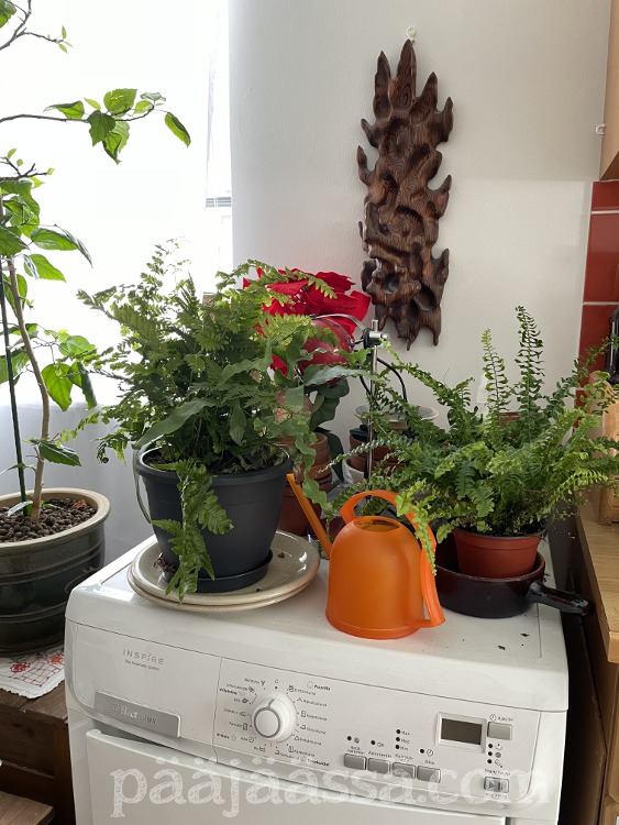 En ole keksinyt parempaa paikkaa kuivausrummulle kuin tuossa keittiössä tasojen jatkeena. Se olisi ollut parempi vastakkaisella puolella tasojen jatkeena, mutta sitten sen oviluukku ei aukenisi oikeaan suuntaan. Sitä olisi todella työlästä käyttää. No mutta, sen päälle sopii nyt sitten jotain huonekasveja kuitenkin, ja väliaikaisesti saniaiset saavat olla tämän päällä. Saniaisten taakse on kätkeytynyt joitain pois heitettäviä saviruukkuja, ja taitaa siinä olla vielä joulutähtikin (tekokasvi) odottamassa varastointia.