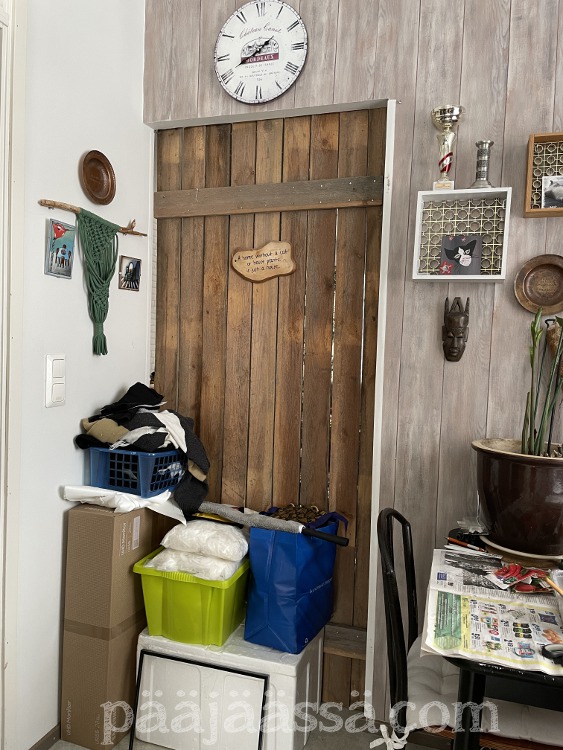 Edellisestä kuvasta ei saanut selvää, mutta kulman takana on piilossa vielä yksi sotku, joka pitäisi siivota pois. Tähän on kertynyt vähän kaikenlaista. Laitan lautaoven eteen sitten tuon pyörillä olevan matalamman puupömpelin (edellinen kuva) ja sen päälle tulee huonekasveja. Miten tuo seinätapetti näyttää nyt jotenkin ihan hirvittävältä? Pitää yrittää malttaa olla repimättä sitä pois eikä aiheuttaa itselle lisää suuria projekteja!