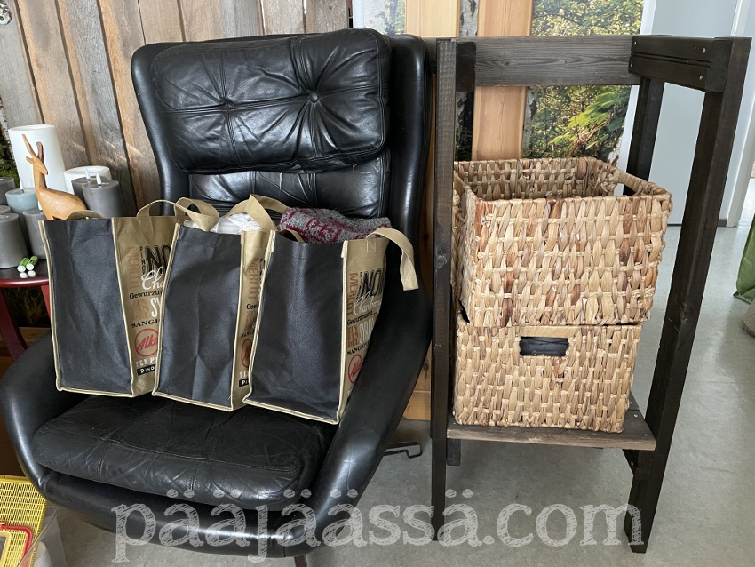 Olen laittanut jonkin käsityöprojektin aina silloin tällöin alkon non woven-kasseihin, ja ne pitää myöskin siirtää pois näkyviltä. Sain roskalavalta niitä lisää kun alkujaan niitä oli vain yksi. Ne ovat käteviä, koska sisällä on lenkit pulloja varten. Käsityöprojekteissa niihin tietenkin laitetaan lankakerät.