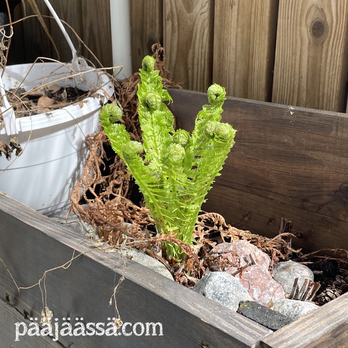 Hommasin parvekkeen pesua varten retkisuihkun, jos sillä saisi huuhdeltua kunnolla lattiaa, kun on ensiksi harjannut sen puhtaaksi. Juuri tämän siivoamisen takia haluaisin kaikki multahässäkät hittoon, kun niistä tulee niin paljon sotkua. Olin aikeissa purkaa kaikki puiset laatikotkin parvekkeelta, mutta sitten yksi kotkansiipisaniainen päätti kurkistaa talven jälkeen laatikosta, ja enhän minä raaski sitä siitä poistaa. Saniaset ovat suosikkejani kuitenkin, eikä niitä haittaa, jos kesä on kylmä.