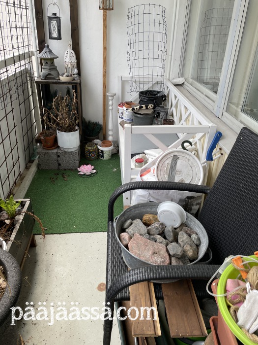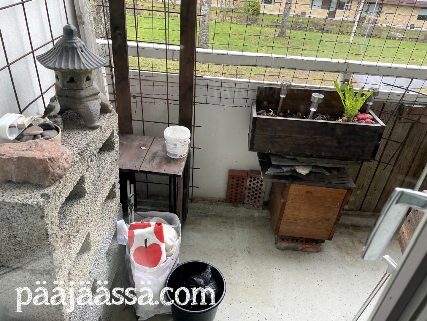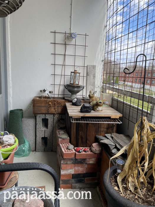 Toisaalta parvekkeelle tulisi todella paljon tilaa, jos puusohvan saisi suoraan tuohon parvekkeen oven kohdille kaidetta vasten. Ainoa asia, joka minua tässä kohtaa askarruttaa, että jos tulee jokin myrsky, niin kestääkö pavilijongin seinä sellaista. Viime kesän se kesti todella hyvin. Minulla odottelee vanhempieni luona pieni patja, joka on tarkoitettu puusohvan päälle laitettavaksi. Sille pitäisi vielä jossain kohtaa ommella jokin suojus. En ole vielä ihan varma mistä sen teen. Joka tapauksessa patja ei saisi kastua parvekkeella, ettei se homehdu. Mietin myös maton laittamista parvekkeelle. Mitä ikinä parvekkeelle teenkin, se pitäisi ensin saada jotenkin pestyä kunnolla.