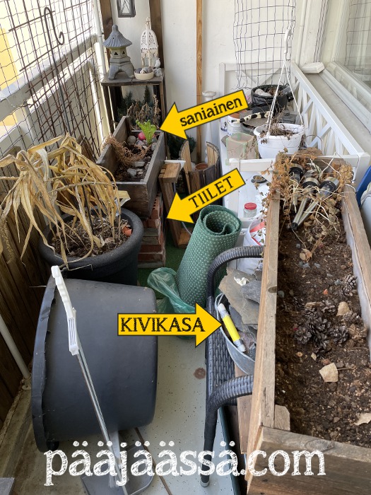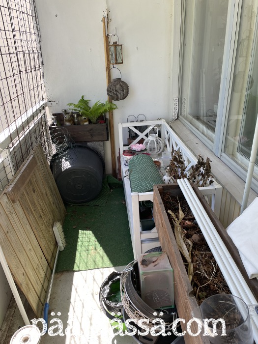 Kauheaa, mikä projekti tuosta parvekkeesta taas alkaa kehkeytyä. Olen onneksi saanut tehtyä siellä jotain. Ja onneksi sain avukseni pari nuorta vahvaa naista, jotka tulivat hakemaan parvekkeeltani kaikki kivet pois! Heidän mukaansa lähti kaikki luonnosta keräämäni kivet sekä liuskekivipinkka. En ollut uskoa silmiäni, kun toinen näistä naisista otti koko liuskekiviröykkiön kerralla mukaansa ja vei autoon. Aikas vahva tapaus.