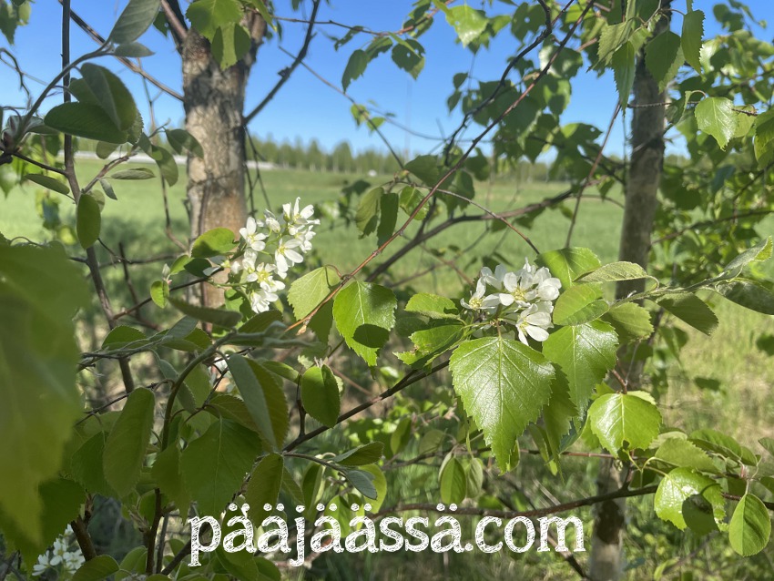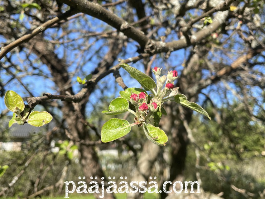 Vanhempieni mahtava omenapuu on myös ihan täynnä kukkia. Kimalaisia ei näy heidänkään pihalla yhtään. Minua alkaa hieman jo huolestuttaa. Onko niille käynyt jotain? Kävin eilenkin vanhemmillani pyörähtämässä päivällä, eikä pölyttäjiä näkynyt missään. Jäämmeköhän ilman omenasatoa tänä vuonna?