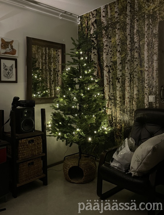 Koristelin eilen myöhään illalla joulukuusenkin. Nyt on palloa ja vaikka mitä. Se on kyllä niin hauskan näköinen tuossa koivutapetin edessä. Siksi se saa siinä ympäri vuoden ollakin – ilman koristeita siis. Jätän valot siihen paikoilleen kun ne ovat tunnelmalliset ja usein aika hankalat viritellä. Ei niitä tarvitse pitää päällä.
