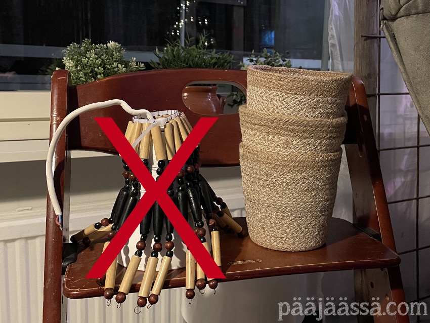 11.12. järjestelin eteisen kukkaruukkukaappia ja sain tiskipöydältä ylimääräiset kukkaruukut pois näkyviltä. Ja kas kummaa. Kaapista löytyikin oiva vaihtoehto, tai jopa ratkaisu pitkään kestäneeseen pulmaan. Olen tehnyt useamman eri viritelmän kasvilamppujen kuvuista, enkä meinaa sitten millään löytää asiaan mieluisaa ratkaisua. On mennyt aika paljon aikaa kun olen kasaillut helminauhoja ja sen semmoista. En missään tapauksessa halua mitään muovisia roikkuvia lampunvarjostimia, vaan jotain, joka käy DIY-hengen mukaisesti olohuoneeseeni. Lamppu on pidempi kuin tavallinen LED-lamppu, eikä se mahdu mihin vain. En haluaisi ostaa enää yhtään mitään tänne, jos kerran saisin loihdittua jotain toimivaa mitä kämpästäni jo entuudestaan löytyy! Sitä paitsi, juuri nyt ei olisi edes rahaakaan ostaa mitään krääsää.