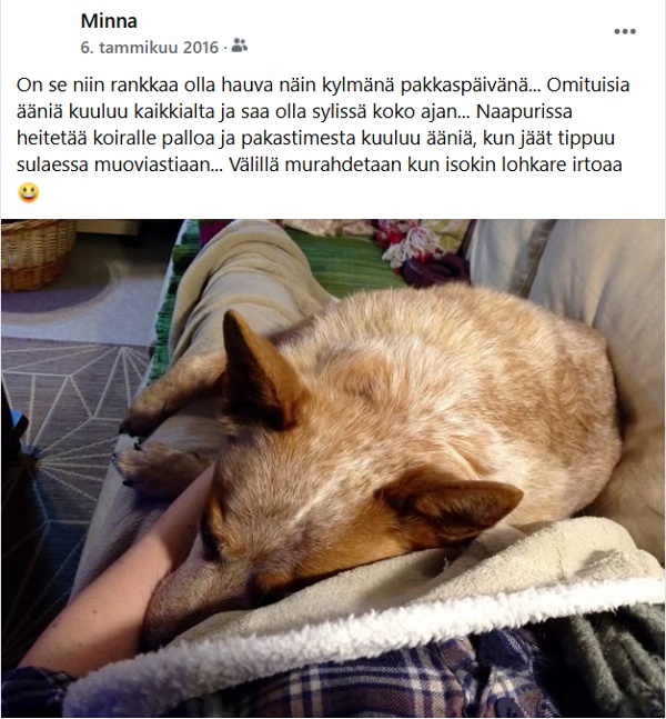 Oikein hyvää alkanutta vuotta kaikille ja olkoon tämä vuosi mahtavampi kuin edellinen! Lopuksi vielä Facebook-muistoissa eteen tullut kevennys menneiltä vuosilta. Näitä hetkiä on vaan vieläkin ikävä, vaikka hauvelin pois menosta on kohta jo kuusi vuotta.